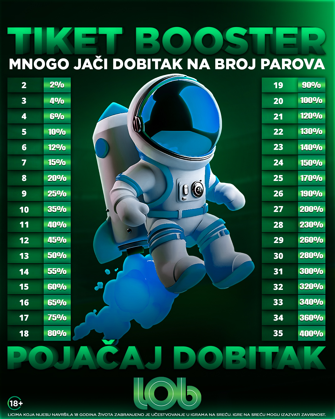 Povećanjem broja parova na tiketu, uvećavate i Vaš dobitak do čak 400%. Bonusi važe i za mečeve koji su u toku (uživo kladjenje).