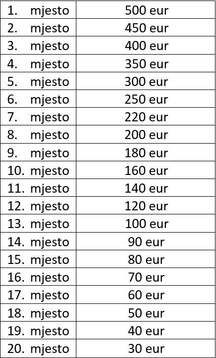 Fond nagrada dijeli prvih 20 takmičara koji su ostvarili najveći broj poena i nagrade se dodjeljuju na sledeći način: