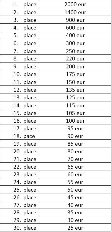 The prize pool is shared between the first 30 players who have achieved the highest number of points and prizes will be awarded as follows: