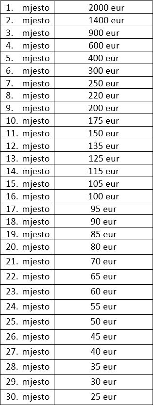 Fond nagrada dijeli prvih 30 takmičara koji su ostvarili najveći broj poena i nagrade se dodjeljuju na sledeći način: