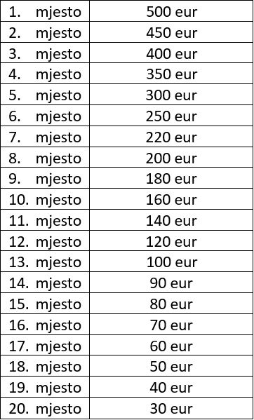 Fond nagrada dijeli prvih 20 takmičara koji su ostvarili najveći broj poena i nagrade se dodjeljuju na sledeći način: