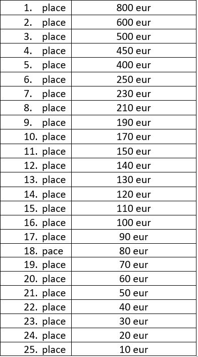 The prize pool is shared between the first 25 players who have achieved the highest number of points and prizes will be awarded as follows: