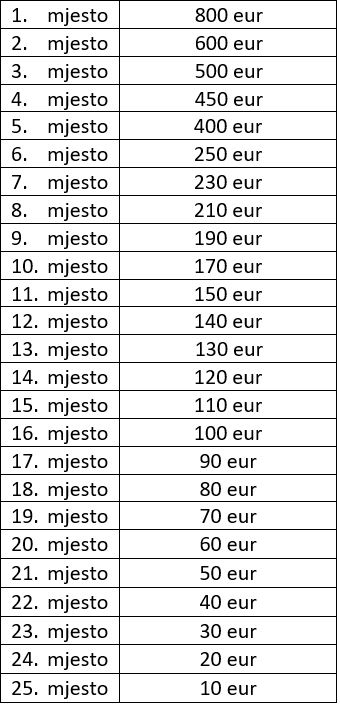 Fond nagrada dijeli prvih 25 takmičara koji su ostvarili najveći broj poena i nagrade se dodjeljuju na sledeći način: