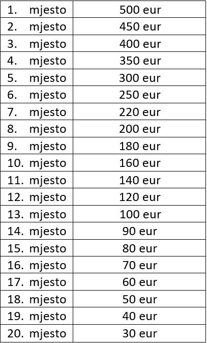 Fond nagrada dijeli prvih 20 takmičara koji su ostvarili najveći broj poena i nagrade se dodjeljuju na sledeći način: